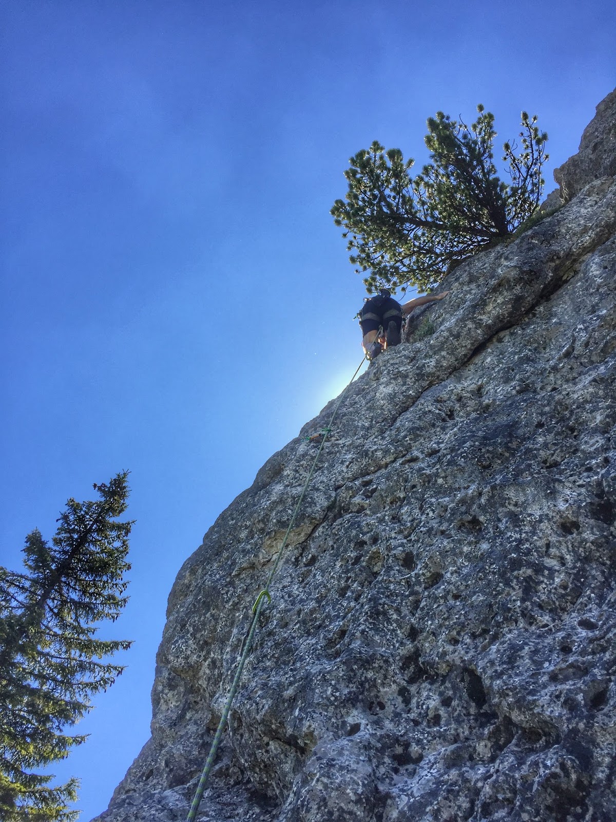 Geklettert sind wir auf der Nordseite die Routen Schafskopf (1SL 4), Kolben Blick (2 SL 4), Krone (1SL 3),Bürste (1SL 5) und Seide (1SL 5+) Das war ideal bei der Hitze heute.