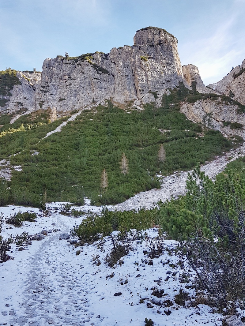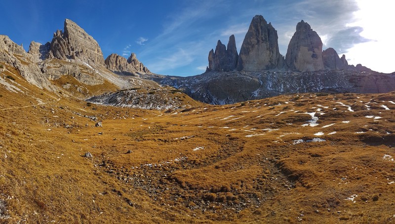 Wenn man die Hochebene erreicht hat, dann sieht man die drei Zinnen in ihrer vollen Pracht. Leider steht am Nachmittag die Sonne immer hinter den Zinnen. Bald kommt man dann allerdings auf die Route, die fast ohne Höhenmeter von den Parkpätzen der Refugio Auronzo herüberziehen. Dann war schon deutlich mehr los.