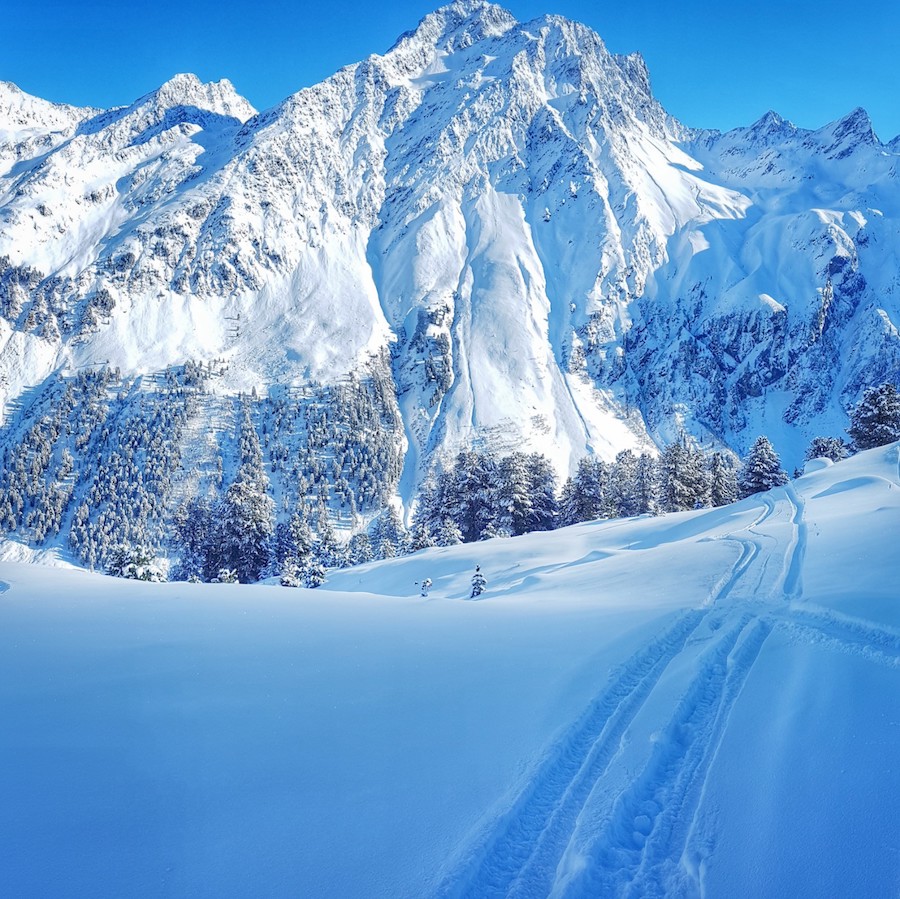 Wir hatten uns die Schöntalspitze herausgesucht um mal wieder einen 3000er zu besteigen, zugegeben der Dezember ist nicht gerade der ideale Monat dafür. Starke Schneefälle und der Lawinenlagebericht brachten uns dann ins Zweifeln und wir sind nach Praxmar zum Beginn der Route auf die Lampsenspitze gefahren. Dort sind allerdings um 8:30 schon so viele gestartet, dass mir die Lust vergangen ist. Eine gewisse Einsamkeit ist das wichtigste bei einer Bergtour überhaupt. Also sind wir doch nach Lüsens weiter gefahren, lieber auf den Gipfel der Schöntalspitze verzichten als mit vielen Menschen unterwegs zu sein. Bei -14 Grad sind wir gestartet und haben uns durch den kurzen Waldgürtel entlang der Skitouren-Ausschilderung geschraubt. Es wurde hier eine neue Route festgelegt, die auch deshalb sehr positiv ist, weil man auf eine Hangquerung verzichten kann. Dadurch kommt man jetzt bis zum Gipfelhang der Schöntalspitze mit einer nur sehr geringen Lawinengefahr.