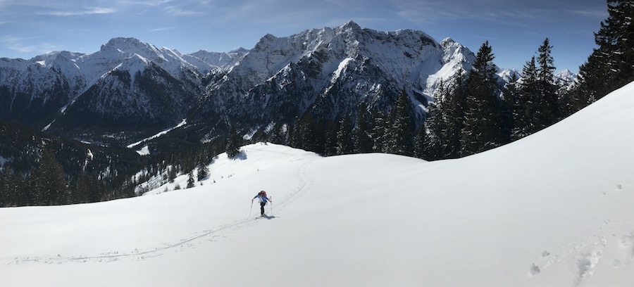 Wir kämpften uns hoch und fanden dann auf der Nordseite nochmal spitzen Schnee. Als vierten Ansteig sind wir dann noch zur Scheinbergspitze-Route hochgestiegen um einfacher wieder zu den Fahrrädern zu kommen.
