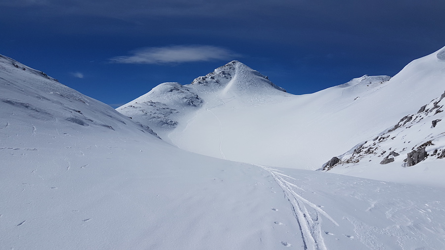 Der südseitige Anstieg zur Weitalpspitze war erwartungsgemäß im unteren Bereich schon sehr ausgeapert, aber wir konnten uns noch so durchmogeln, wenn auch teilweise nur auf 5mm Neuschnee.