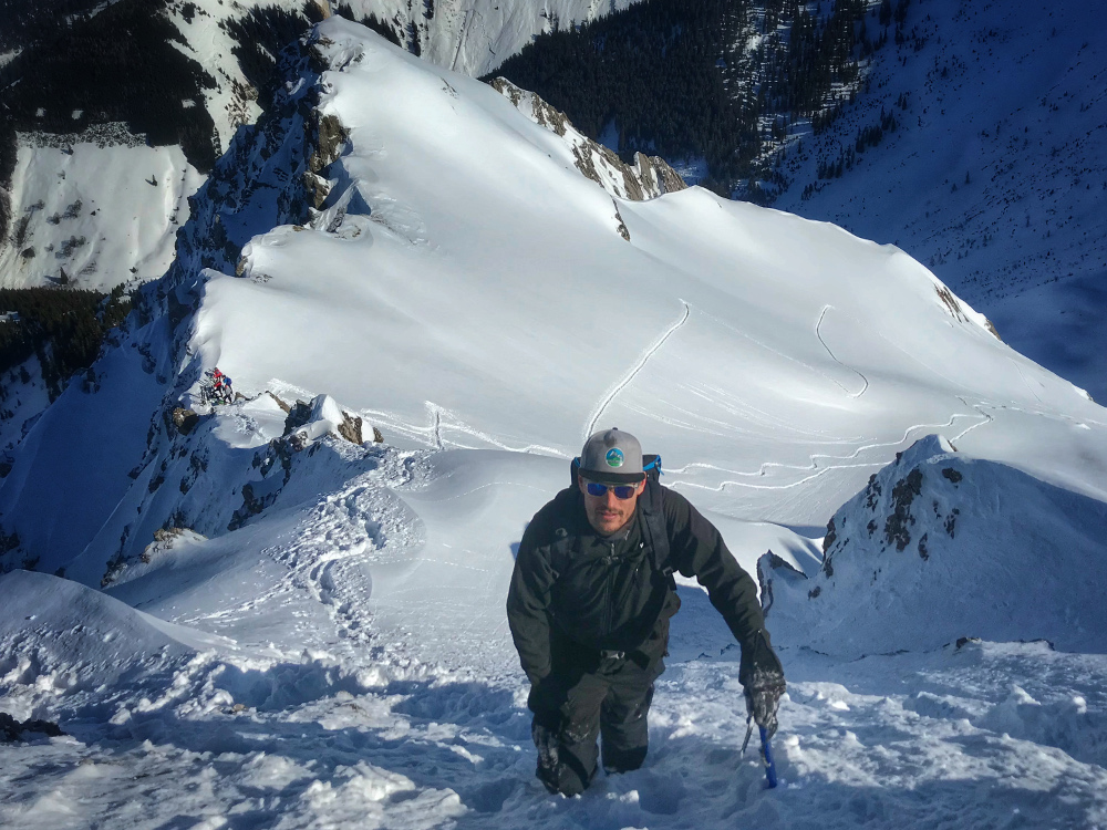 Etwas anspruchsvolles nordseitiges sollte es heute sein, so sind wir auf den Roten Stein gekommen. Diese Tour ist steil aber nicht wirklich schwierig bis zum Skidepot in der Scharte. Der Fussweg bis zum Gipfel ist eine alpine Unternehmung und seperiert den eben den Funsport-Skifahrer vom Bergsteiger. Aber auch vor dieser Fusspassage muss man keine Angst haben wenn man konzentriert geht und idealerweise einen leichten Pickel dabei hat um beim Abrutschen auch das passende Werkzeug in der Hand zu haben. Ich persönlich wundere mich ja oft warum Skitourengeher auch steile Passagen zu Fuss in hartem Schnee meistens mit den Skistöcken gehen. Die sind zwar ganz nett um die Balance zu halten, aber wenn man ins Rutschen kommt helfen die überhaupt nicht. Hier war der leichte Eispickel mit Sicherheit eine gute Wahl und wir genossen diese tolle Passage zum Gipfel.