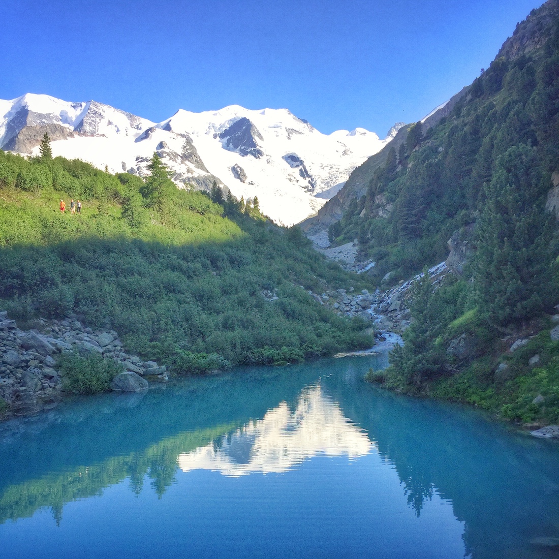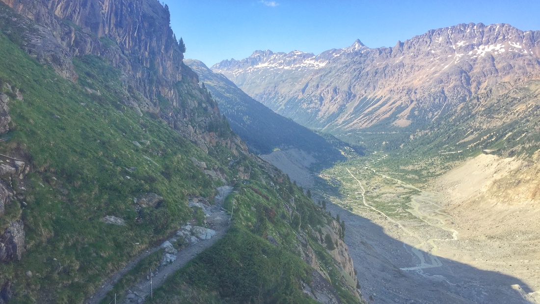 Vom Bahnhof Morteratsch führt eine super Kurzwanderung zur Bovalhütte, ideal um die hochalpine Landschaft rund um den Piz Bernina aufzusaugen. Direkt über dem Morteratschgletscher geht es auf einem unschwierigen Wanderweg gleichmäßig ansteigend zur Hütte. Bis zum Nachmittag liegt dieser allerdings in der Sonne, deshalb bin ich erst um 16:30 am Bahnhof losgelaufen. Ende Juni geht das problemlos. Von der Hütte hat man den besten Blick auf den gegenüberliegenden Piz Palü.